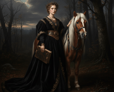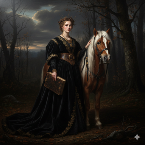 Elle ne fuit pas la nuit ; elle y rentre comme en son royaume. Tenant ce flambeau avec la solennité des anciennes gardiennes, elle s'avance au pas lent de sa monture. Mais alors que la lisière du monde connu s'efface derrière elle, une question demeure suspendue au souffle de l'animal :